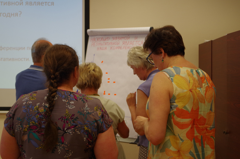 В ходе сессии участниками с применением фасилитационных техник групповой работы («check-in» и «check-out» вопросы, «трейлер», «MeWeUs», мировое кафе, голосование метками и др.) были сформированы критерии значимости и результативности конференции, актуальные направления научной дискуссии, целесообразные форматы мероприятий и др. аспекты проведения конференции. Участники встречи положительно оценили новый формат групповой работы, а также отметили необходимость более активного использования фасилитационных техник в деятельности Института.