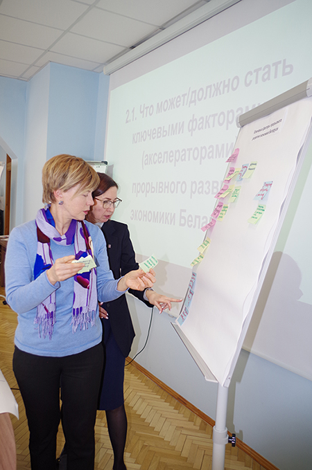 Участники форсайт-сессии обсуждались следующие вопросы: что может (должно) стать ключевыми факторами (акселераторами) прорывного развития экономики Беларуси; что надо сделать, чтобы преодолеть существующие препятствия. Коллективное проектирование выявило следующие доминирующие факторы экономического прогресса: личная безопасность экономических агентов, изменение принципов госуправления, декриминализация рисков; внедрение современных систем управления, импорт технологий; разделение функций регуляторов и собственников; трансформация системы государственного регулирования экономики.