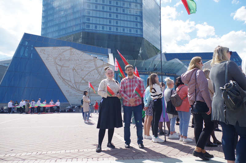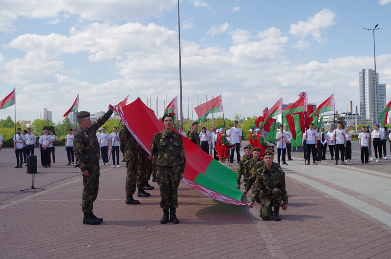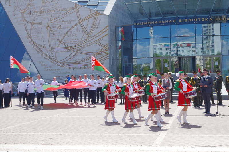 Общереспубликанская эстафета, приуроченная ко Дню Государственного флага, Государственного герба и Государственного гимна Республики Беларусь, проходила на площади возле Национальной библиотеки под звуки оркестра с разворотом Государственного флага Республики Беларусь.