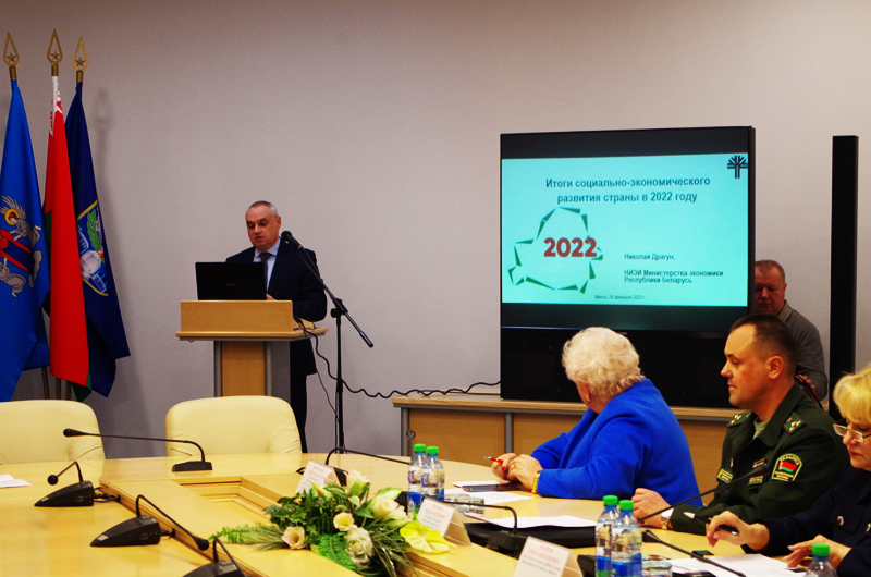 Докладчик подробно охарактеризовал макроэкономические и социально-политические условия, в которых функционировала экономика Беларуси, ключевые решения Правительства страны, направленные на противодействие и смягчение негативного влияния санкций недружественных государств: принятие и реализация Комплексного плана по поддержке экономики; создание и функционирование при Совете Министров в режиме 24/7 Оперативно-ситуационного штаба; меры финансовой поддержки экспортеров и преодоления барьеров для экспортных поставок.