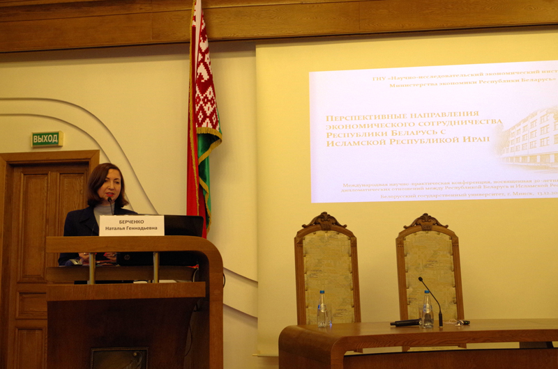 Директор института Наталья Берченко в своем выступлении акцентировала внимание участников конференции на перспективах экономического сотрудничества Республики Беларусь и Исламской Республики Иран.Беларусь, обладая развитыми промышленным, сельскохозяйственным, агропромышленным комплексами, готова предложить Ирану широкий спектр современных высокотехнологичных товаров.