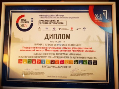 Коллектив Научно-исследовательского экономического института Министерства экономики Республики Беларусьна XXI Общероссийском форуме «Стратегическое планирование в регионах и городах России» отмечен дипломом за вклад в подготовку и проведение мероприятий международного устойчивого трека «Сотрудничество для устойчивого развития».