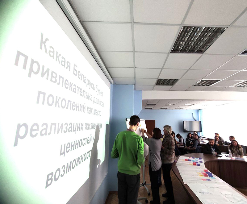 На этапе «Поиск решений» участникам сессии был предложен исследовательский вопрос: какая Беларусь будет привлекательна для всех поколений как место реализации жизненных ценностей и возможностей? Используя метод брейнрайтинга, группы сформировали видение будущего страны, комфортной для настоящих и будущих поколений. По их мнению, Беларусь – независимая, экономически развитая, высокотехнологичная, с высоким качеством жизни и равенством возможностей, интегрированная в мировое сообщество и сохраняющая самобытность страна.